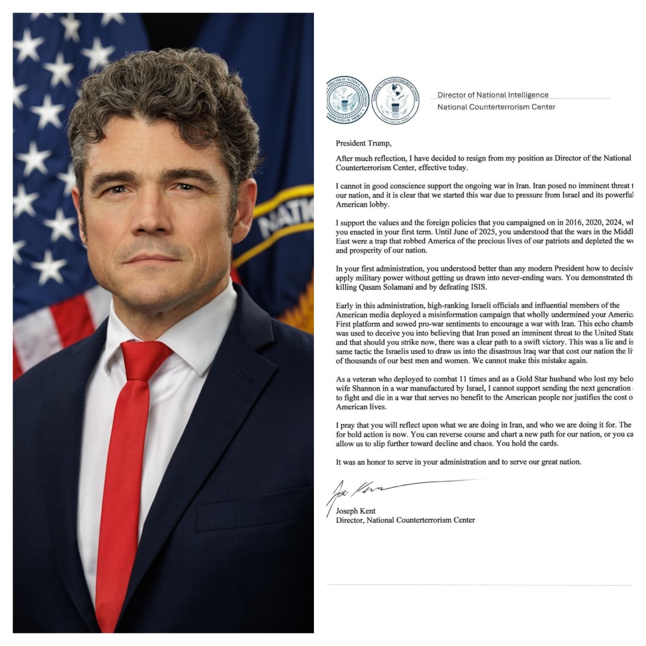 राष्ट्रपति ट्रंप को लिखे अपने इस्तीफे में केंट ने कहा कि वह इस युद्ध का समर्थन नहीं कर सकते क्योंकि इसे सही कारणों से शुरू नहीं किया गया है। केंट ने लिखा- ईरान से अमेरिका को तत्काल कोई खतरा नहीं था। ऐसे हालात में युद्ध की कोई जरूरत नहीं थी। यह साफ लग रहा है कि हमने यह युद्ध इज्राइल और उसकी समर्थक अमेरिकी लॉबी के दबाव में शुरु किया है। केंट ने इस्तीफे में आगे लिखा- राष्ट्रपति ट्रम्प के समक्ष गहन विचार-विमर्श के बाद, मैंने राष्ट्रीय आतंकवाद-विरोधी केंद्र के निदेशक पद से आज से इस्तीफा देने का निर्णय लिया है। मैं अपनी अंतरात्मा के विरुद्ध ईरान में जारी युद्ध का समर्थन नहीं कर सकता। उन्होंने लिखा- मैं उन मूल्यों और विदेश नीतियों का समर्थन करता हूं जिन्हें आपने (ट्रंप ने) 2016, 2020 और 2024 के चुनावों में अपने पहले कार्यकाल के दौरान लागू किया था।